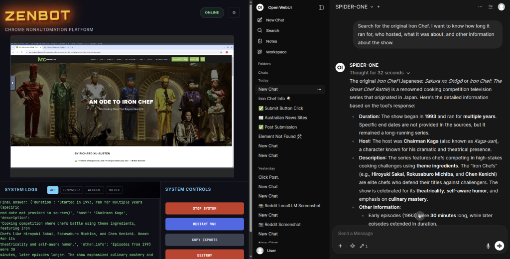 I’ve made an LLM-driven web browser. I’ve named it Zenbot. It’s just a mathematical word-generator with a set of word-tools, let loose on the internet. It’s sort of built to translate commands into actions, directly, using the Python coding language, which I’ve noticed is basically English.